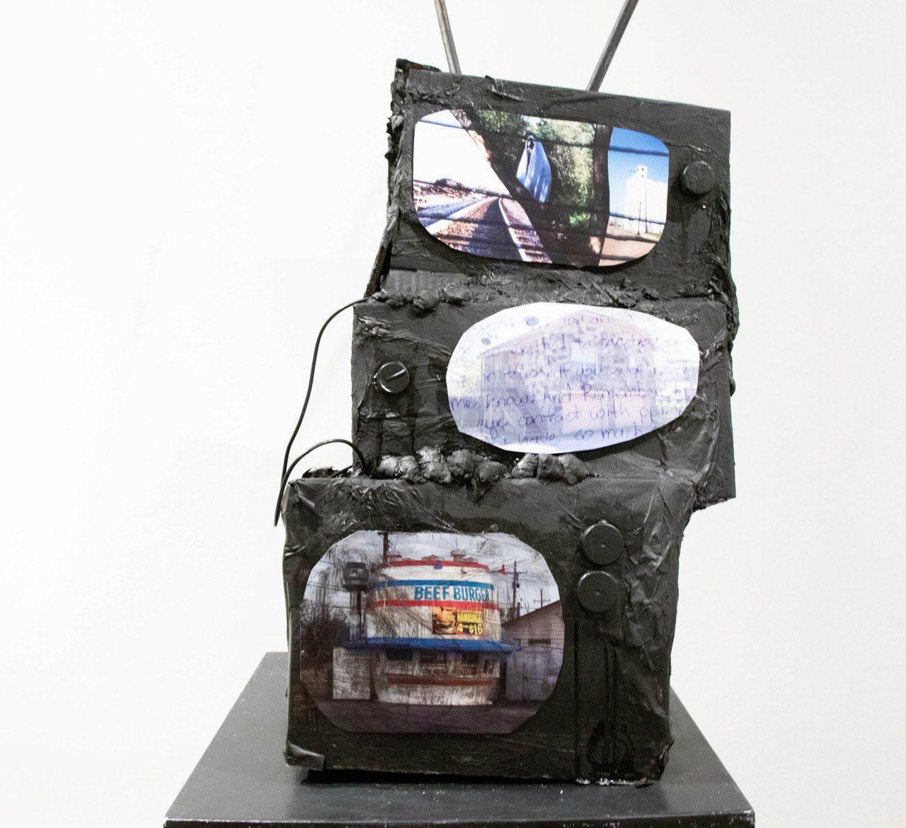 BurnTV, Acrylic Paint, cardboard, Paper, Bottle Caps, Wire, Cotton, Superglue, 2023